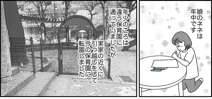 私はメイコ(33)。年中の娘、ネネがいます。今、下の子を妊娠中で、これから子どもを2人育てることを考えると夫婦2人ではなかなか難しく、両親や夫と相談をして、実家近くに引っ越しを決めました。保育園も転園したのでまだ慣れておらず、ママ友もいません。新しい保育園は延長保育が長いので、お迎えに行った時間に他の保護者がいないこともよくあります。ママ友を作ろうとは思っていないのでそれは問題ないですが、知り合いがいないとトラブルがあったときに困ることも……。