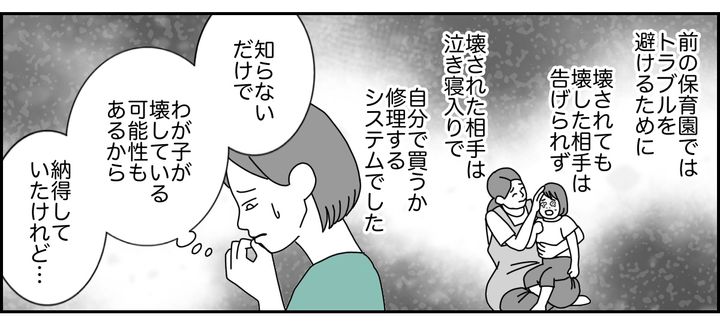 前の保育園で持ちものを壊されときは、トラブルを避けるために、壊した相手は告げられませんでした。