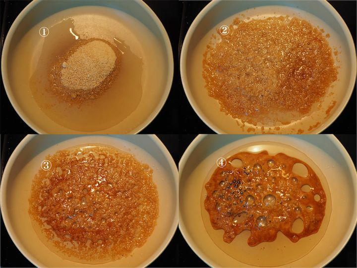 火加減は指定がなかったので、中火で調理。結晶化してしまうので、あまり触らずじっと待ちます。全体をなじませたいときは、フライパンを平行に揺するのがコツ。