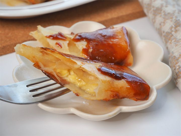 ある程度冷めると、キャラメルはパリッと固まり、美しいツヤが出てまるで飴細工のよう。かじるとバリッと軽快な音を立てて割れ、サクサクの春巻きの皮とはまた違う、厚みのあるキャラメルの歯ごたえが楽しめます。中からは、とろっとやわらかなバナナが現れて、パリッ・サクッ・とろっの食感が絶妙に重なり合うんですよ♪