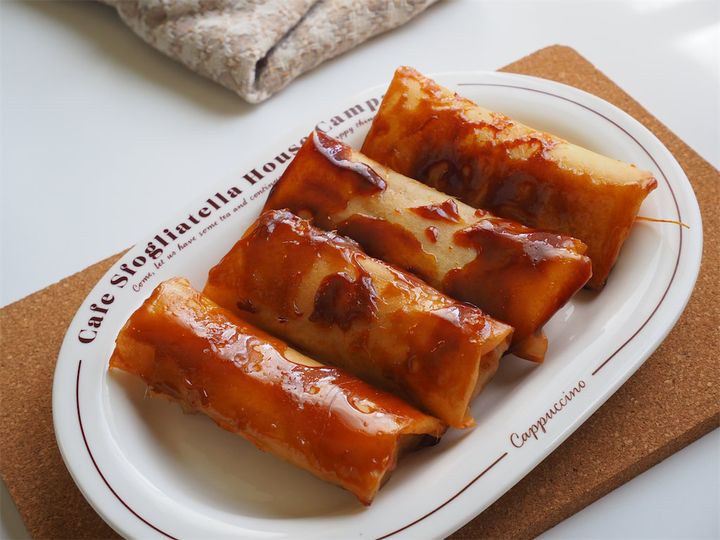 みなさんは「トゥロン」ってご存じでしたか?トゥロンは、フィリピンを代表する屋台スイーツのひとつ。タガログ語で、「バナナ春巻き」って意味なんだとか。バナナを春巻きの皮で包んで揚げ、さらに砂糖でキャラメルコーティングするのが特徴。カリッと揚げた皮の中には、とろりと甘いバナナ。外はパリパリ、中はとろとろというコントラストがクセになるポイント。現地では学校帰りや市場で気軽に買える「ストリートフードの定番」として親しまれています。そんな親しみやすさと甘い誘惑を、おうちで手軽に再現できるなんて最高!旅行気分で作ってみましょう♪