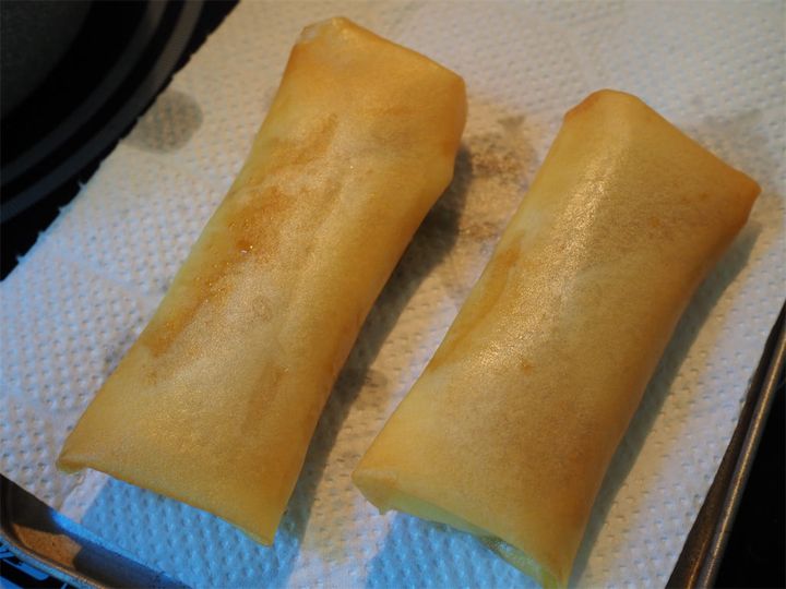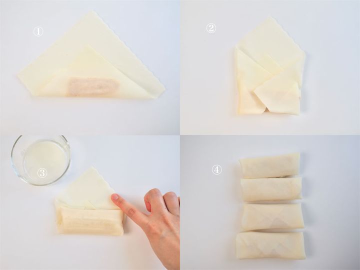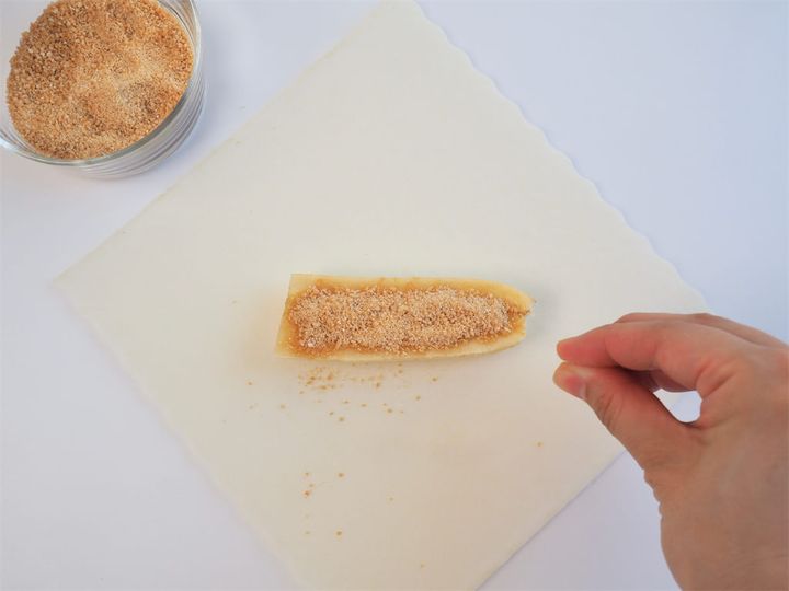 2. 春巻きの皮に1のバナナをのせ、甜菜糖をふりかけて、巻く。閉じ口は水溶き小麦粉で留める。