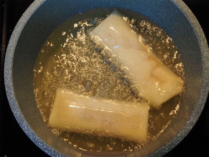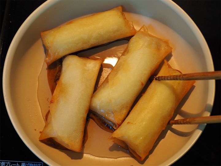 4. 別のフライパンに甜菜糖、3の揚げ油(大さじ2)を入れ加熱し、全体がこげ茶色になってきたら、3の春巻きを入れて火を止める。