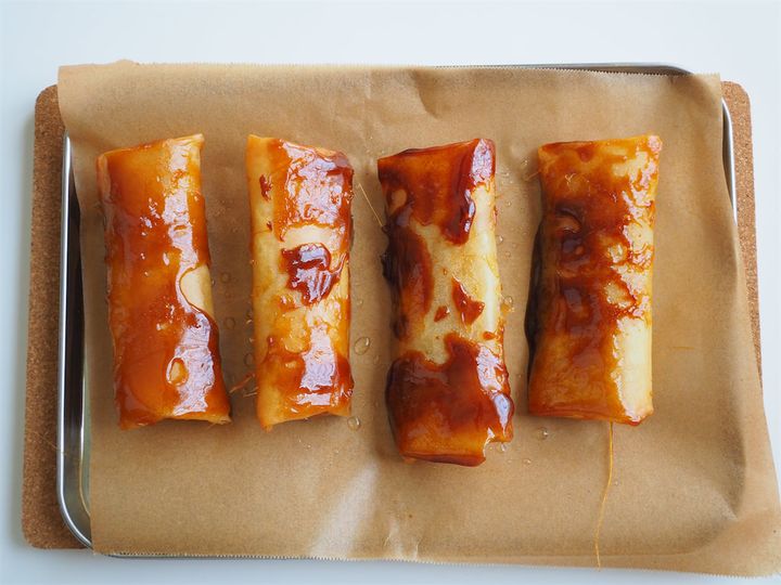 5. 春巻き全体にキャラメルを絡めたら、クッキングシートにのせて冷ます。キャラメルが固まったら完成!