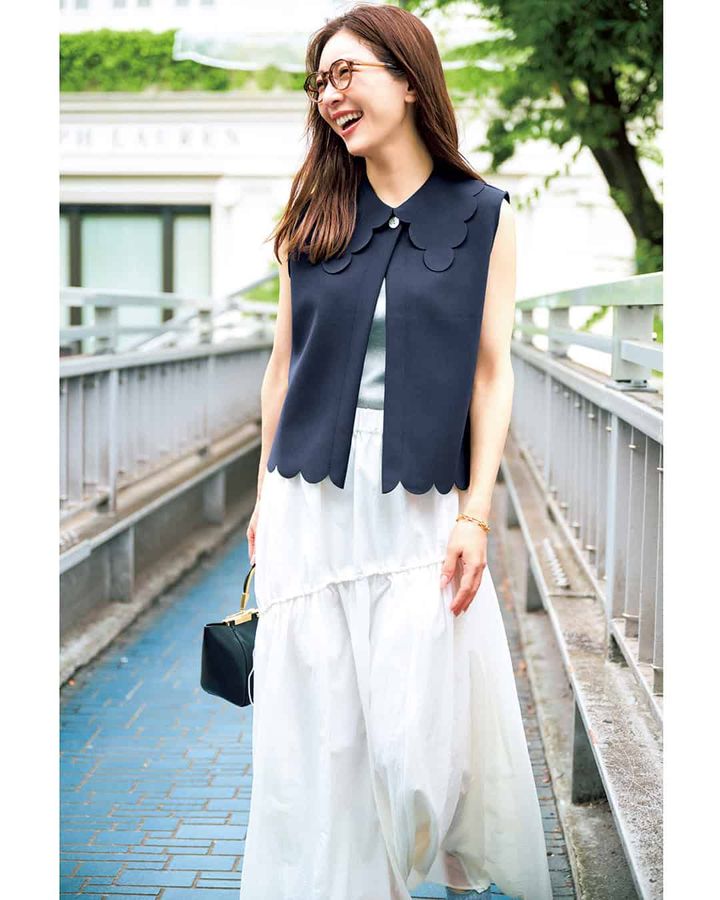 ベスト¥11,900(swanë)タンクトップ¥3,990(アンフィーロ/アンフィーロ〈オンワード樫山〉)スカート¥17,600(アンクレイヴ/アンクレイヴ〈オンワード樫山〉)メガネ¥35,200(ブラン/ライト)ブレスレット¥10,500(クロレココ/ロードス)バッグ/スタイリスト私物