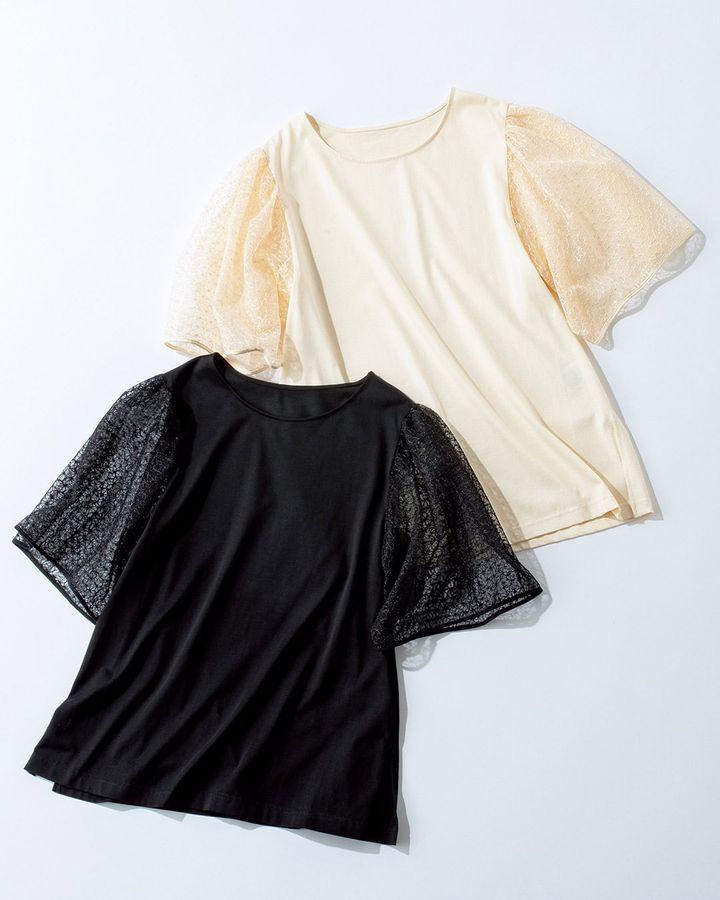 五分丈のレース袖が肩回りから二の腕をカバーしつつコーデに彩りを加えます。ボディはカットソー素材でネットに入れれば、マシーンウォッシャブルにも対応。汗をかく時期も重宝。