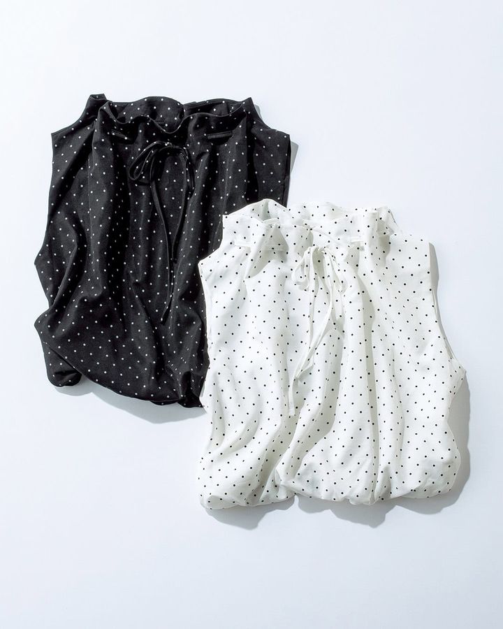 しなやかな素材にドットをプリント。裾がバルーンデザインなのでボトムスにインしなくてもサマになります。衿もとのリボンもさりげないフェミニンさを加えます。