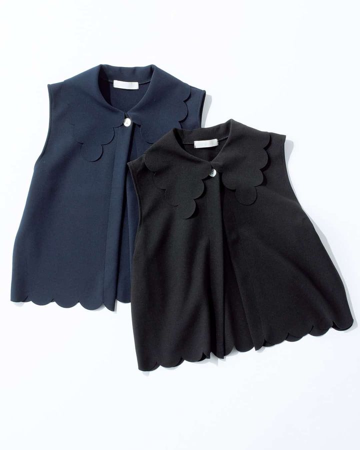 衿と裾の雲のようなディテールが目を引くベスト。暑い時期は1枚で、秋はニットに重ねて、アウターも羽織れるコンパクトさで通年着られる万能アイテムです。