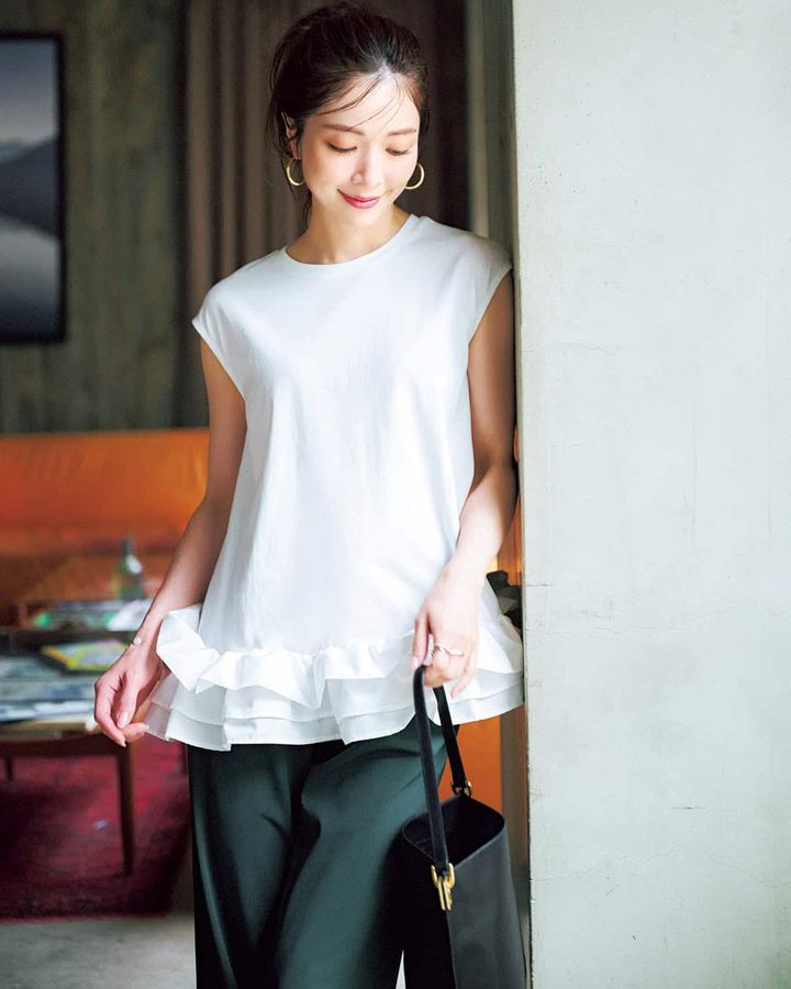 トップス¥7,590(ブラン)パンツ¥29,700(ハイク/ボウルズ)バッグ¥37,400(オルセット/オルサ)ピアス¥11,000(ワンエーアールバイウノアエレ/ウノアエレジャパン)リング¥48,400(ミチウィルウェイ/フォーティーン ショールーム)ブレスレット¥8,900(viola /ロードス)
