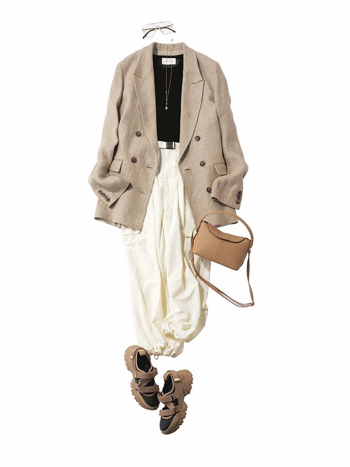 パンツ¥41,800(フィーニィー) ジャケット¥63,800(HER.) ニット¥17,600(スタンブリー/ヒューエルミュージアム)バッグ¥47,300(ヴァジック/ヴァジックジャパン)スニーカー¥13,200 (ル タロン/ル タロン 有楽町マルイ店)サングラス¥50,600(モスコット/モスコット トウキョウ) ネックレス¥24,200(マリハ)