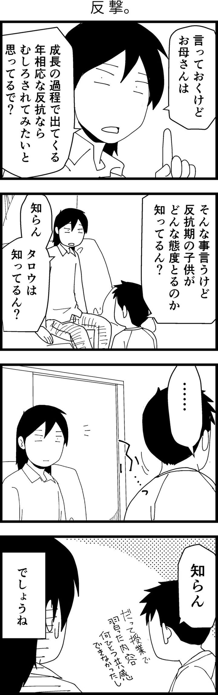 「年齢相応の反抗期を一度は体験してみたい」と思っていたはるたけめぐみさん。しかし、息子のタロウくんに「反抗期の子どもって、どんな態度をとるか知ってるん?」と聞かれると、答えに詰まってしまったそうです。そこで今度は逆に、同じ質問をタロウくんへ投げかけてみたものの、タロウくん自身も反抗期についてよく知らなかったというのです。