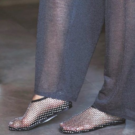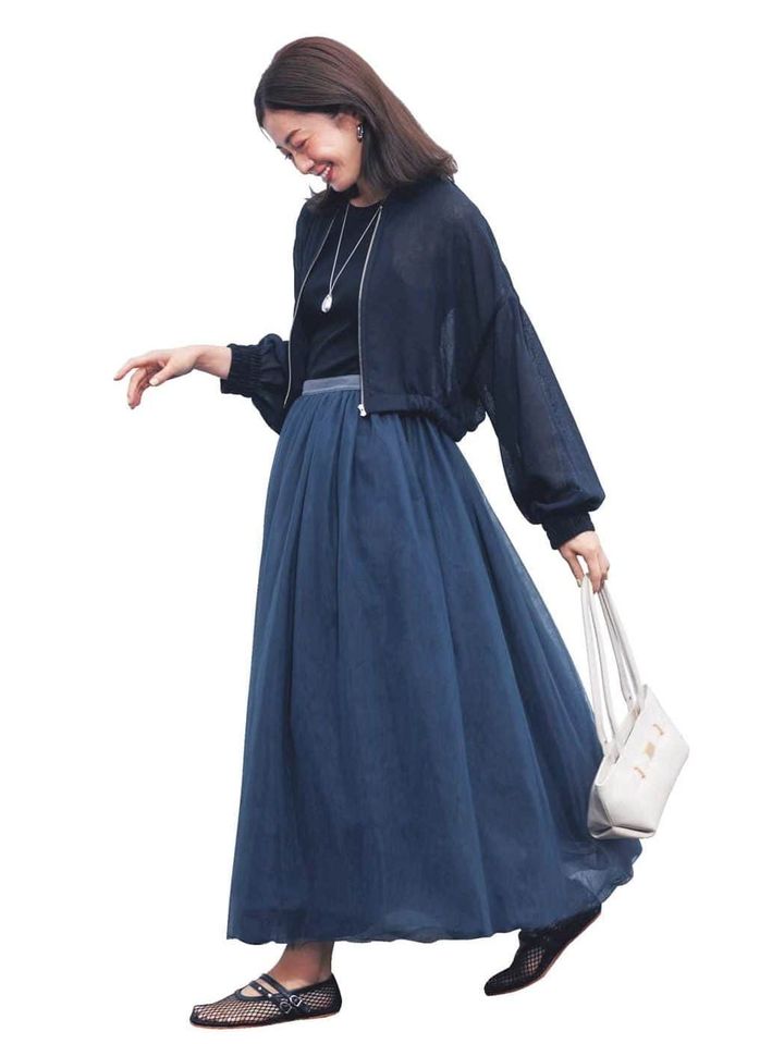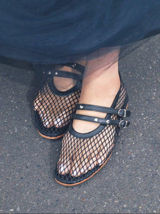 ストラップがついたフェミニンなメリージェーンも、メッシュでモードな印象に。王道のフラットシューズも、ぐっと今っぽくなります。ロングスカートも、抜け感をプラスすることで洗練されたスタイルに◎。