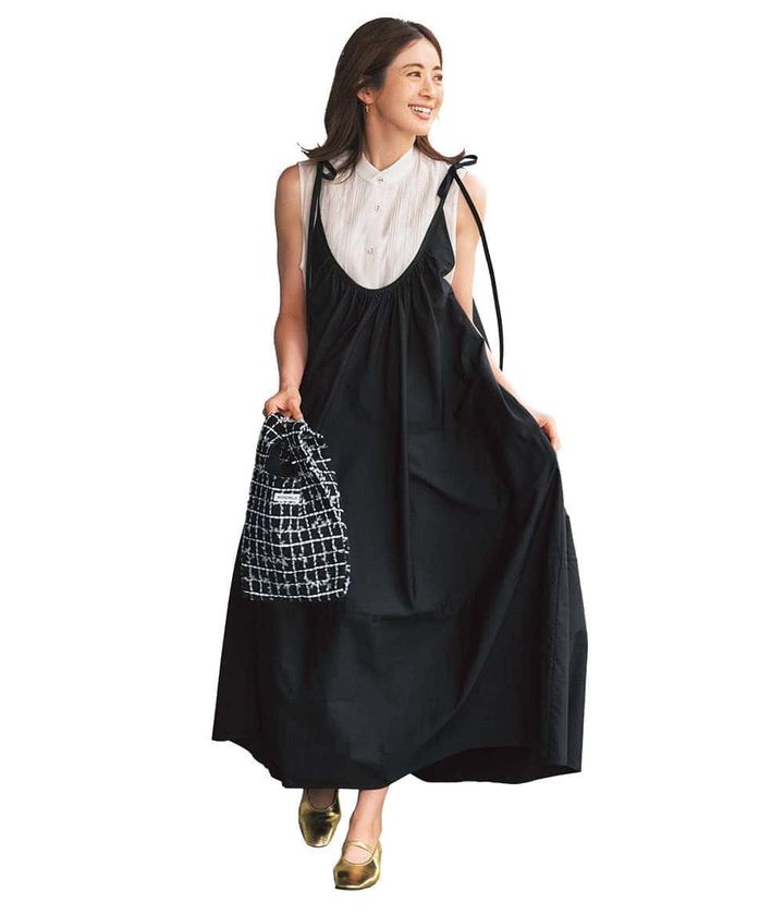 ワンピース¥27,500(HER.)バッグ¥22,000(SEA/エスストア)靴¥15,400(ダイアナ/ダイアナ 銀座本店)ピアス¥71,500バングル¥134,200リング¥75,900(すべてホアキン・べラオ)