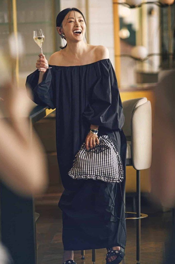 露出多めなオフショルワンピースも、ギンガムチェックのショルダーバッグを合わせれば、程よくカジュアルダウンされこなれた雰囲気に。ギンガム×フリルでも、モノトーンだから大人にちょうどいい甘さに。