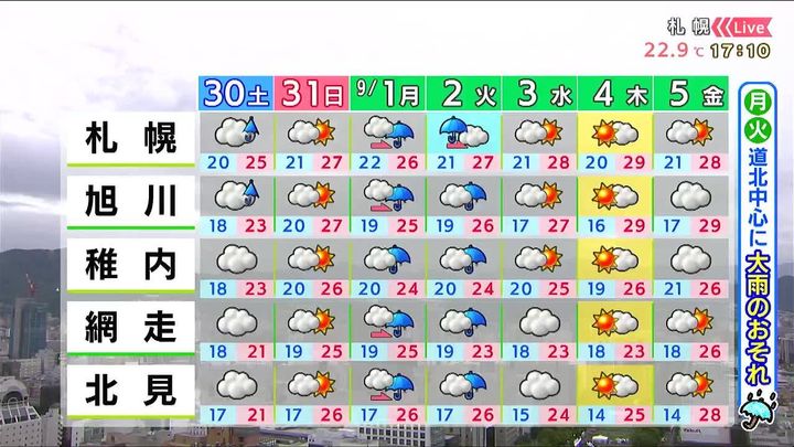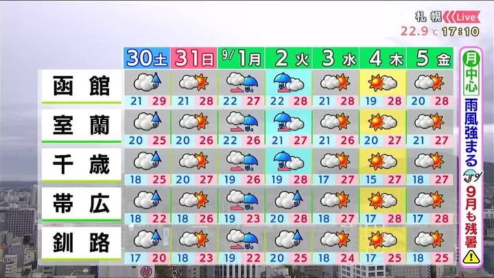 30日(土)~9月1日(月)の札幌の天気