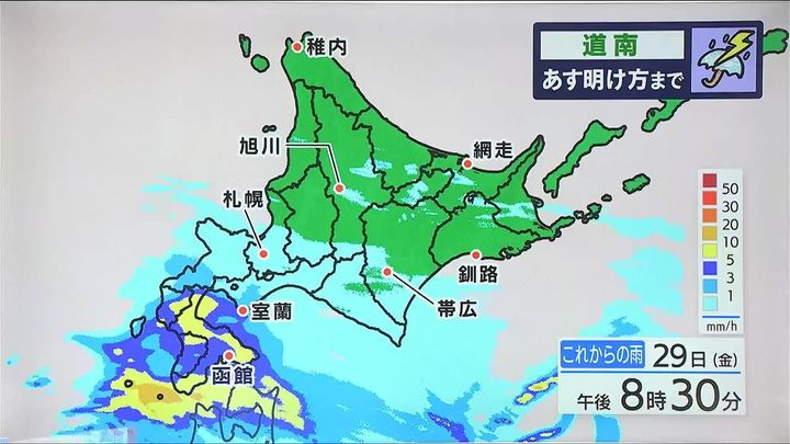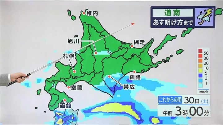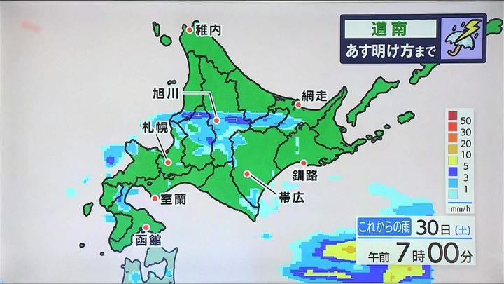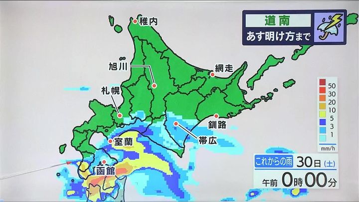 今夜は道南方面を中心に雨が強まり、あす30日(土)明け方にかけて雷を伴うおそれがあります。あす朝になると道北やオホーツク海側でもところどころで雨が予想され、ぐずついた天気となりそうです。