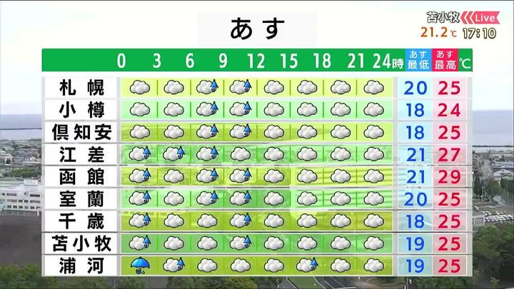 札幌や函館、苫小牧など昼頃まで弱い雨が降るでしょう。浦河は午後も雨の降る時間があるため、外出には雨具が必要です。暑さは控えめですが、室内ではムシムシしそうです。