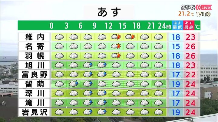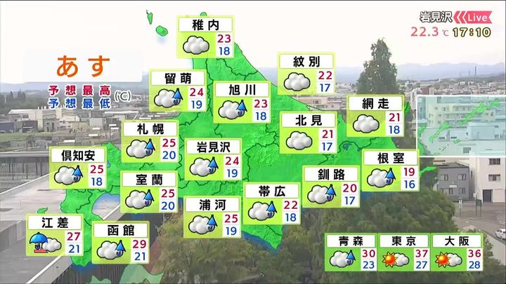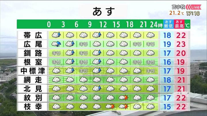 道東は昼頃まで雨で、霧がかかるでしょう。北見も昼頃は通り雨がありそうです。夏日の地点はなく、根室は19度と日中でも羽織る物が欲しくなる気温です。
