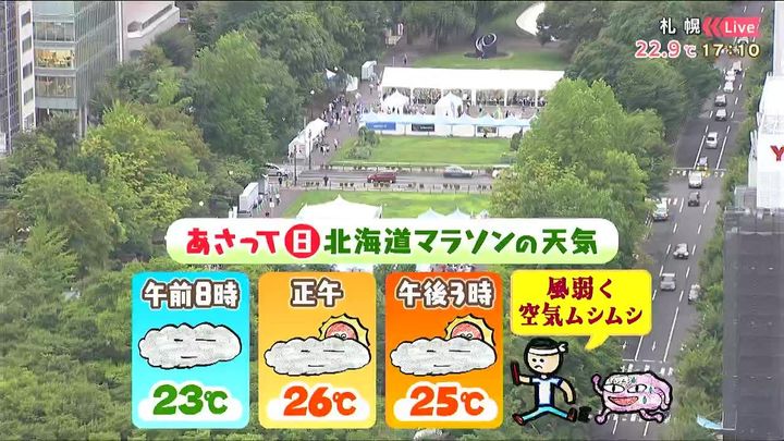日曜の天気ですが、午前8時頃は曇り空ですが、レースがスタートすると、太陽君やムシムシ君も応援にやって来そうです。昼間の気温は25度くらいですが、風がなく、不快な暑さになりそうです。