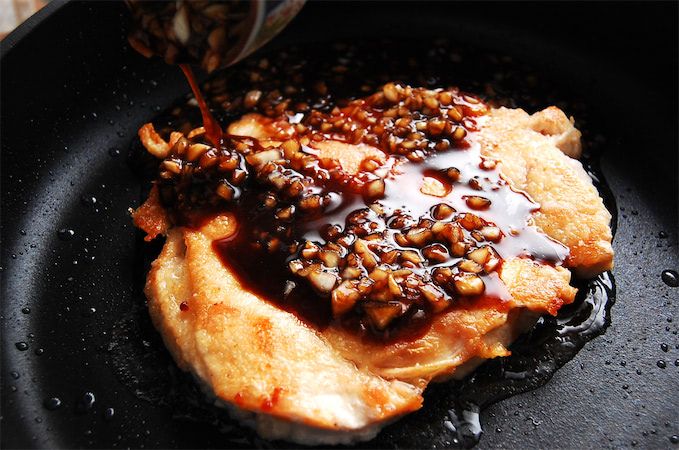8. お皿に鶏むね肉ときつね色に焼いたにんにくを盛り付け、特製ソースをかけたら出来上がり。