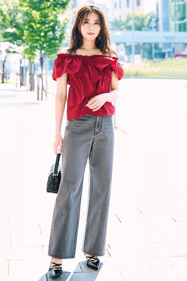 肌見せ加減を自在に操れる秋色ブラウスには、好相性なブラックデニムで季節感の更新。