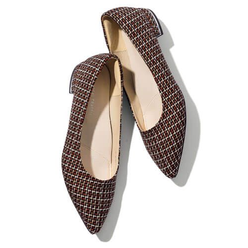 目の細かいチェックは派手すぎず、通勤にも対応可能。ヒールにあしらわれたメタリックラインが上品なアクセントに。