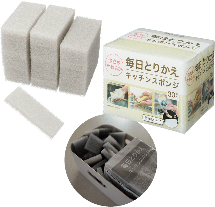 30個入りの使い捨てタイプの食器洗い用スポンジ。愛用の皆さんは食器洗いを終えたら、シンクや排水溝の掃除をして捨てるという小山田さんのような使い方をされることが多いよう。30個入り¥299(ニトリ)