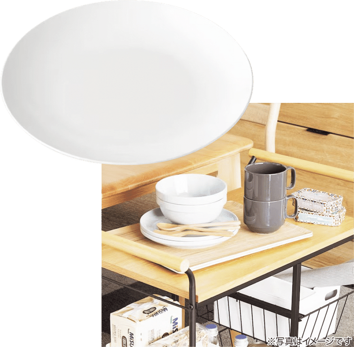O あと、子ども関連だと薄型 すべりにくい 木製トレーでしょうか。かなりバズっていたので愛用されている方も多いかもしれないのですが、これ本当にいいんです! 我が家は食事を定食形式で出すスタイルなので、1人1枚で家族分合計4枚持っていて。ここにお味噌汁、ごはん、おかず、お箸をセットして、出しています。配膳時にも子どもに下げさせるときも安心感があります。これは皆さんにオススメします(笑)。楽に洗える両面撥水 丸プレートも子どものメインのおかずを盛り付けたり、ワンプレートで出すときにも愛用中です。割れないし、洗いやすいし、シンプルで私の求める機能とデザインが両立していて満足。