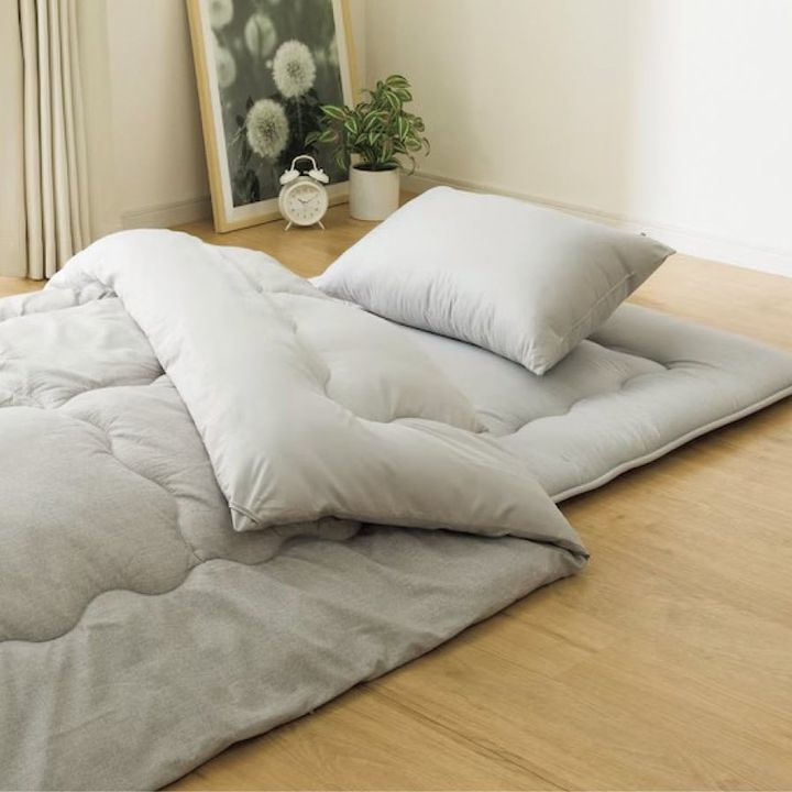 カバー要らずでこのまま使える寝具のセット。子どもの発熱で親に泊まりに来てもらうときなど、急な来客時にも使いやすい。¥4,990(ニトリ)