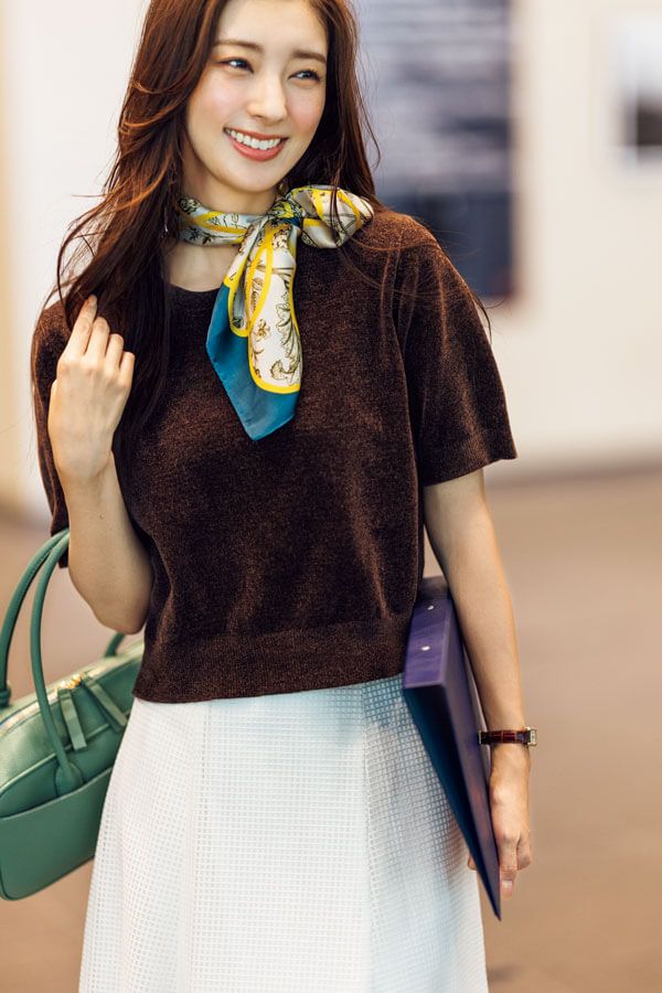 掲載:美人百花2025年9月号「『週4でスカーフを使う』茉由OLのお仕事通勤1カ月着回し」撮影/前田晃(Maettico)[人物]、志田裕也[静物] スタイリング/楠玲子 ヘアメイク/山下智子 モデル/宮本茉由 構成・文/井関さやか 再構成/美人百花.com編集部