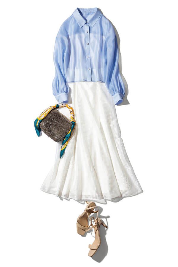 令嬢風きれい色コーデにブラウスのシアー素材で抜け感を