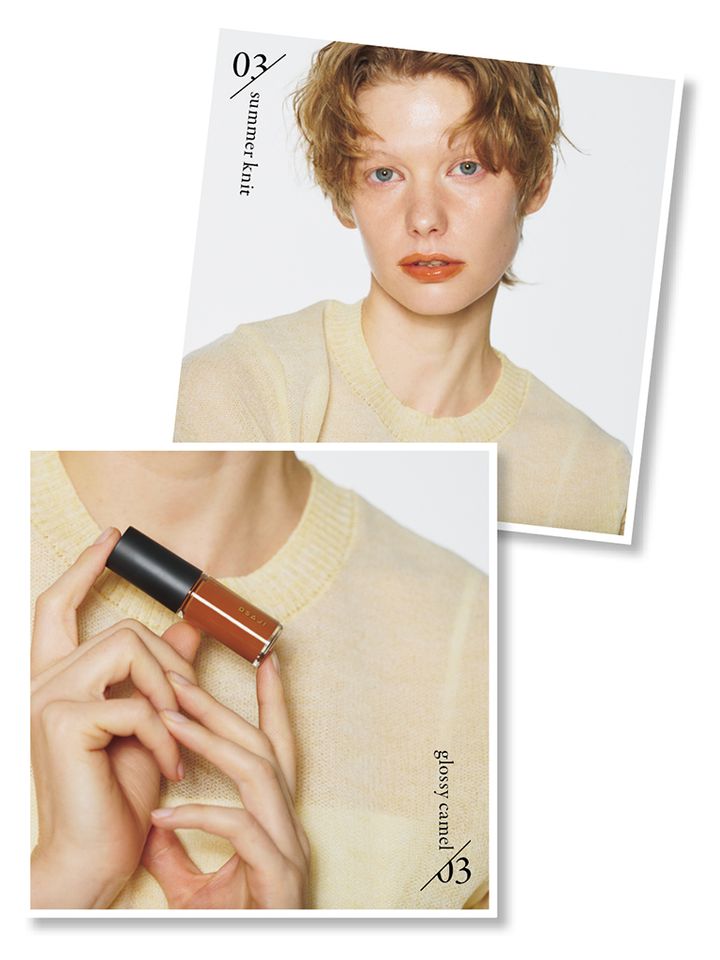 涼しく軽やかなサマーニットにあるといいのは、リップグロスによるほどよい重み。スタイリッシュなイエローとヘルシーなオレンジのニュアンスを感じるマロンブラウンを選んだら、やさしげなペールイエローのニットもリッチな面持ちに。ややオーバーリップにすることで、親しみやすさと愛らしさをキープ。
