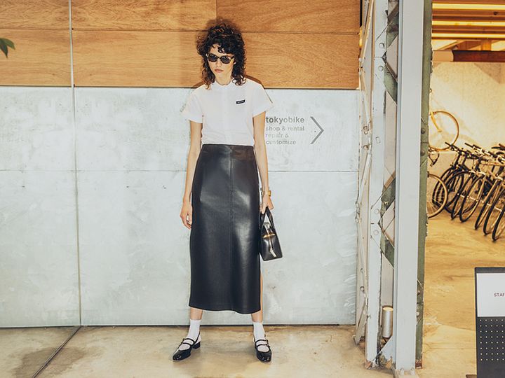 レザーのタイトスカートで大人の深みもキープ