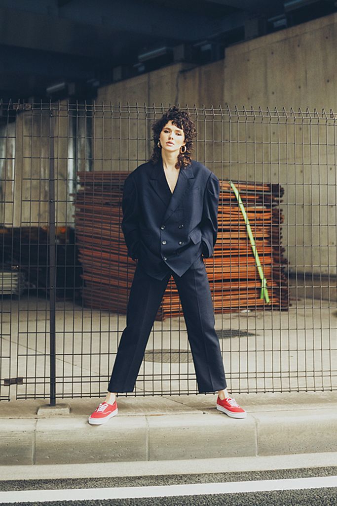 胸元が開きすぎていないため、ブラウスを着るように1枚でまとえる。Vネックから肌をのぞかせて、構築的なセットアップに抜け感も意識。