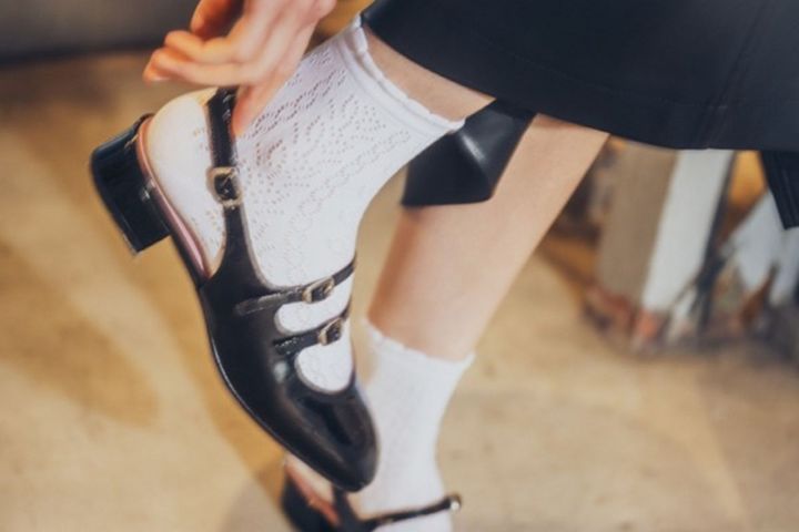 えりとそでに小ぶりなフリルをドッキング。黒のレザースカートで辛口な表情を貫くと、レースソックスを合わせても微糖にとどまる。