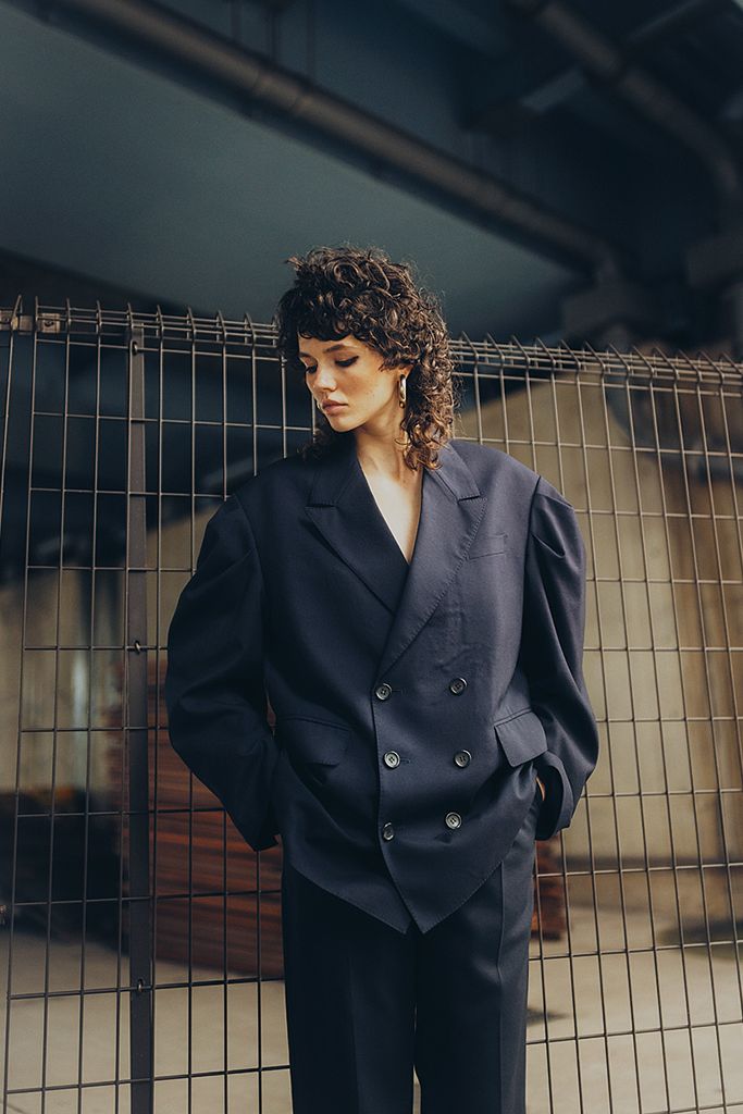 ビッグジャケットの肩幅の余りを生かした、一体感のあるパフスリーブ。トップスでわかりやすく効かせるより、ボリュームジャケットの延長でなじませるほうがガーリーでもモードでもない、新たなバランスが手に入る。