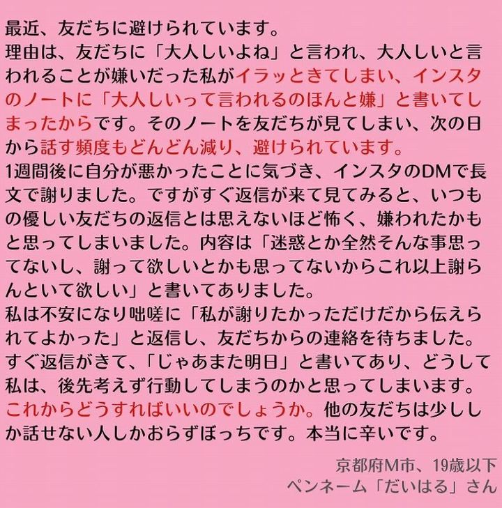 あたしだいはるさんには、今回もめてしまった友だちと実際に会ったときに、目と目を向き合わせた上で「改めて、あんなこと書いてごめん。どう感じたか、率直に教えてほしい」と、頭を下げ、お願いしてみることをおすすめしたいのよね。