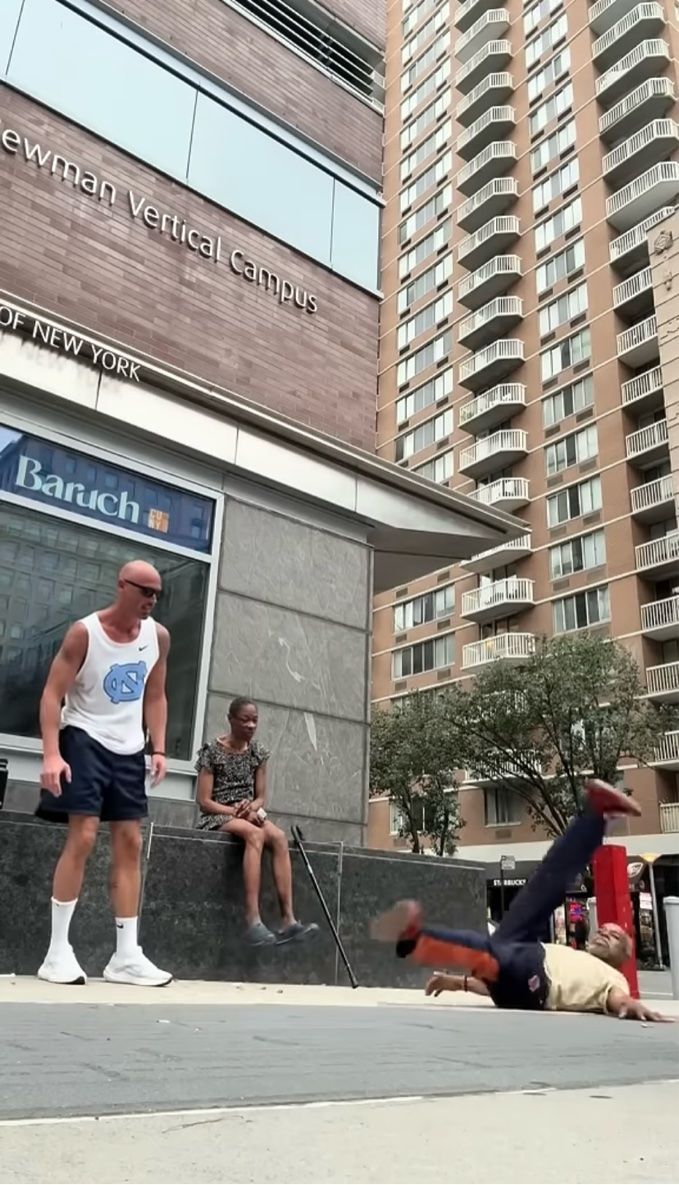 タンクトップ姿の男性が拳を差し出してグータッチを求めると、ブレイクダンスの達人はその手を足で軽やかに飛び越えるというトリッキーな技まで披露! その見た目からは想像もつかない達人の動きに、タンクトップ姿の男性も「まさかの展開でした」とコメントしています。