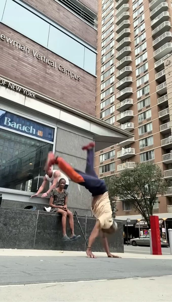 路上で側転を披露する年配の男性を見かけて、一緒に逆立ちを始めた男性。 その直後、この男性は驚きの光景を目の当たりにします。