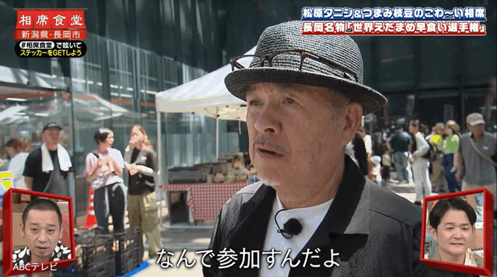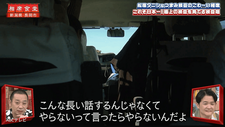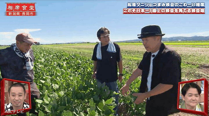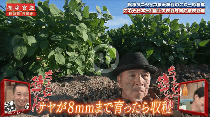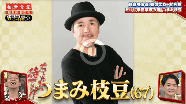 つまみ枝豆といえば、たけし軍団一の武闘派。凶暴すぎて、かの有名なフライデー襲撃事件ではメンバーから外されたらしい。枝豆の狂犬ぶりは、67歳になった今も健在。全国有数の枝豆の産地・新潟県長岡市へやってきた彼は、暑さにキレ、店が開いていなくて『相席食堂』のスタッフにキレ、「世界えだまめ早食い選手権」への参加を勧めてきたディレクターに「その場の賑やかしの、かませ犬みたいなのはやんない!」とキレた。