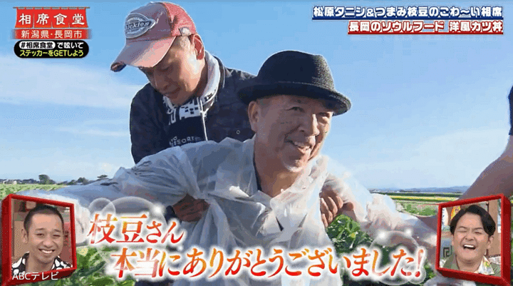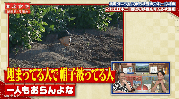 「怖いわ!」「枝豆さんが埋まるとホンマにアウトレイジやねん!」「ちょっと待ってくれ埋め師~!」「引っ張り出さんかったら一生出れん埋め方してたで!」などと、千鳥は大爆笑。枝豆が笑顔で農家と話したり収穫体験をしたりする映像内に、彼が虚無の表情で土に埋まるシーンが時折挟み込まれていたため、千鳥はツッコミが止まらなかった。