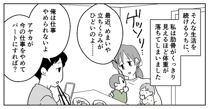どんなにしんどくても仕事はがんばらなきゃ……そう思って必死に毎日を過ごしていたところ、気づけばゲッソリと痩せてしまっていました。それだけではなく、最近はめまいや立ちくらみにも悩まされています。夫はそんな私を見て「俺は仕事やめられないよ」「パートにすれば?」と、いつものごとく他人事です。
