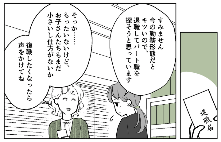 このままでは体がもたないと思った私は、退職してパート職を探すことにしました。「復職したくなったらまた声をかけてね」という上司の言葉は、とてもありがたかったです。