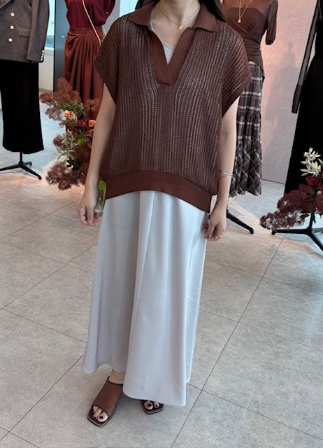 真夏仕様のキャミワンピもさらりとしたブラウンのメッシュニットを重ねるとたちまち秋を感じられるスタイルに!まだまだ暑いけど、秋の雰囲気も感じたい今、ぴったりです。