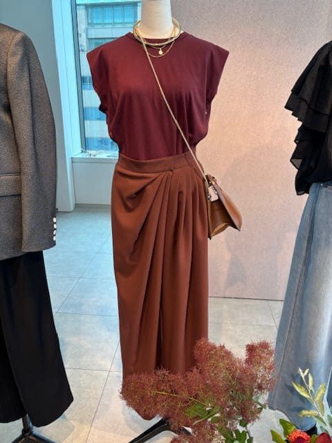 まず最初に気になったのはウエストのドレープが印象的な技ありパンツ。色はひき続き注目のブラウン。ワンツーコーデも一気に華やぐ便利アイテムです。さらにノースリーブトップスもこっくりとした深みのあるボルドーをあわせれば、一気に秋を意識した装いが完成。