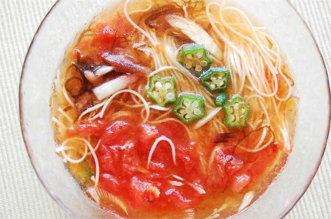 トマトのとろみに、もずくとオクラのとろみも相まって、つゆも少しとろっとしています。そうめんとの絡みや喉ごしも◎。