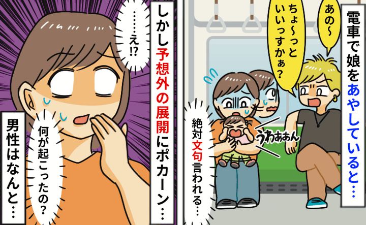 「ちょっといいっすかぁ?」電車で娘をあやす私に金髪男性が声を。え…?文句と思いきや突飛な行動に