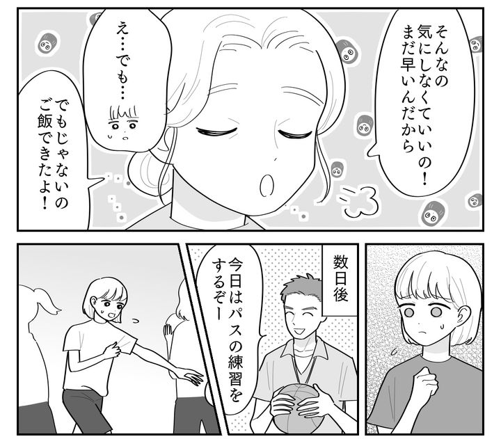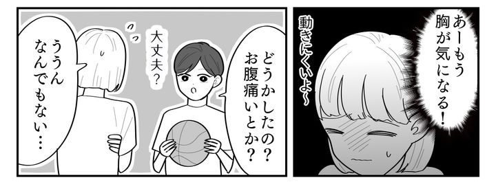 体育の時間は動くたびに胸が揺れます。ボールを追いかけたり、腕を伸ばしたりするのも難しくて……。周りの目が気になって、なんとなくぎこちない動きになっているのが自分でもわかります。友だちのルカがそんな私を心配してくれました。