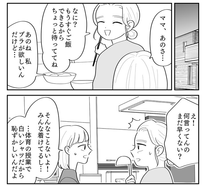 夕方パートから帰ってきたママは、バタバタと夕飯の準備をしはじめました。私は話を持ちかけます。「私、ブラが欲しいんだ。みんな着けてるし……」けれどママには「なに言ってんの」とあっさり話を流されてしまいました。