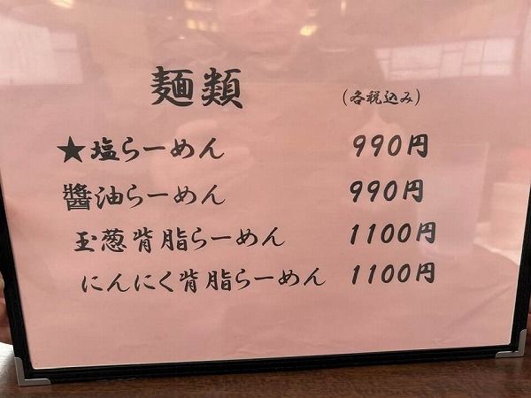 定番はこの4種類。今回は塩ラーメンとにんにく背脂らーめんをプラス100円で大盛にしました。